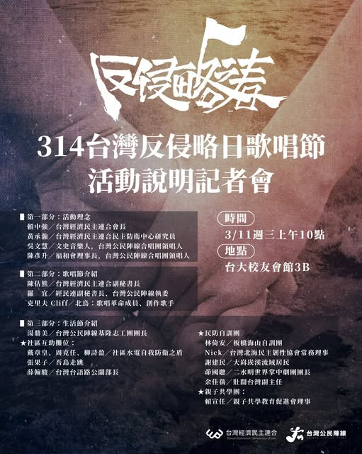 【314台灣反侵略日歌唱節活動說明記者會】2026.03.11記者會採訪通知