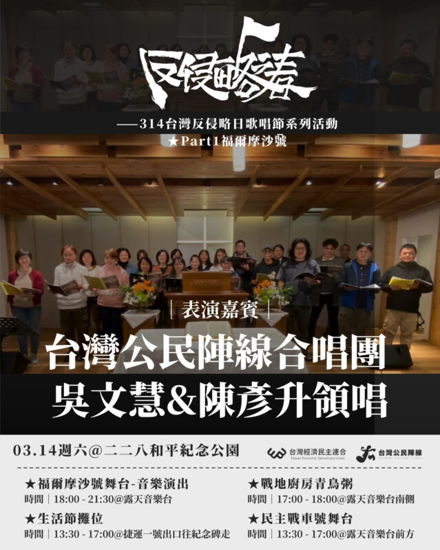 從民主追求到建國——台灣公民陣線合唱團於第一屆314台灣反侵略歌唱節合唱組曲