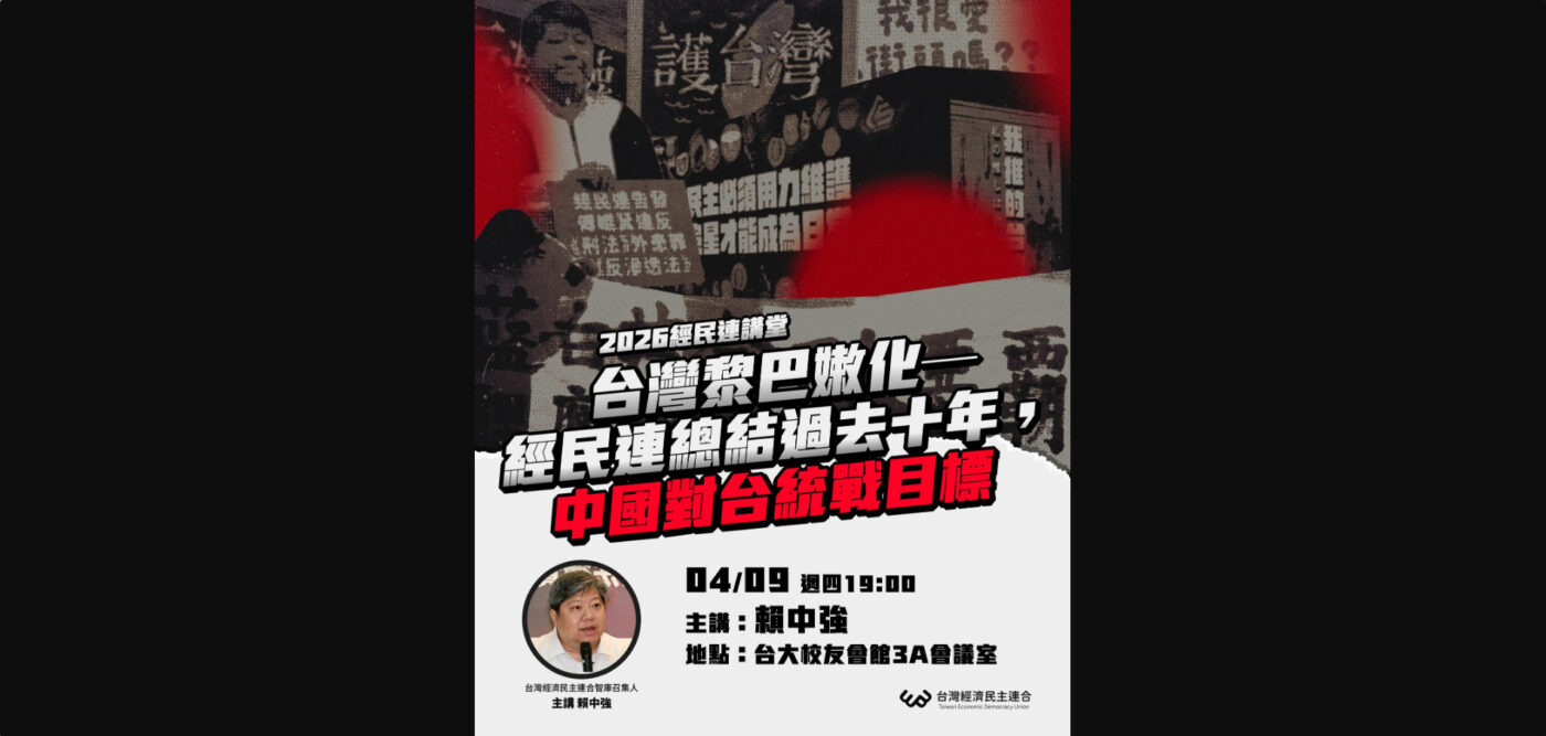 四月九日(星期四)晚上七點,在濟南路台大校友會館,2026年經民連講堂第二季第一堂,賴中強律師為您講解:台灣黎巴嫩化——經民連總結過去十年,中國對台統戰目標。現場活動將預留至少四十分鐘的討論時間,歡迎呼朋引伴,一起來討論。