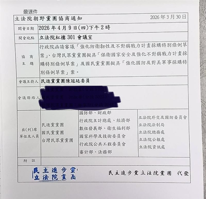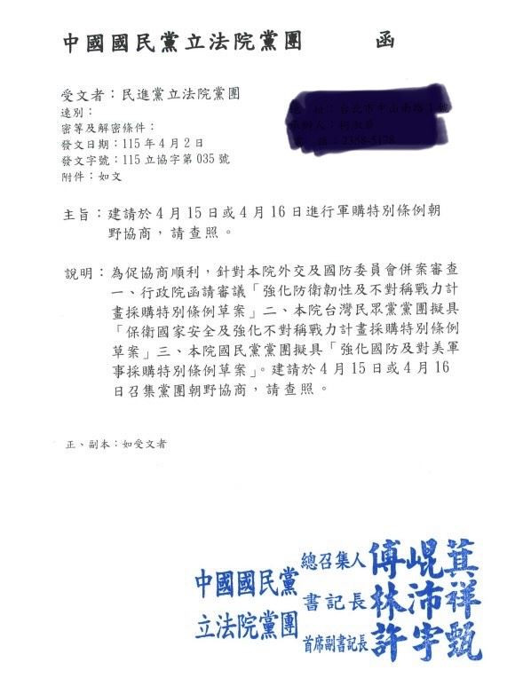中國國民黨主席鄭麗文預計4月7日至12日前往中國,並會見中國共產黨總書記習近平。立法院原訂4月9日舉行的外交國防委員會軍購條例朝野協商,昨天竟傳出中國國民黨團發函要求改期至四月十五日或十六日舉行。民進黨立委林楚茵批評,中國國民黨難道要領完習近平旨意才知道軍購要怎麼談嗎?根本自證是中共傳聲筒。