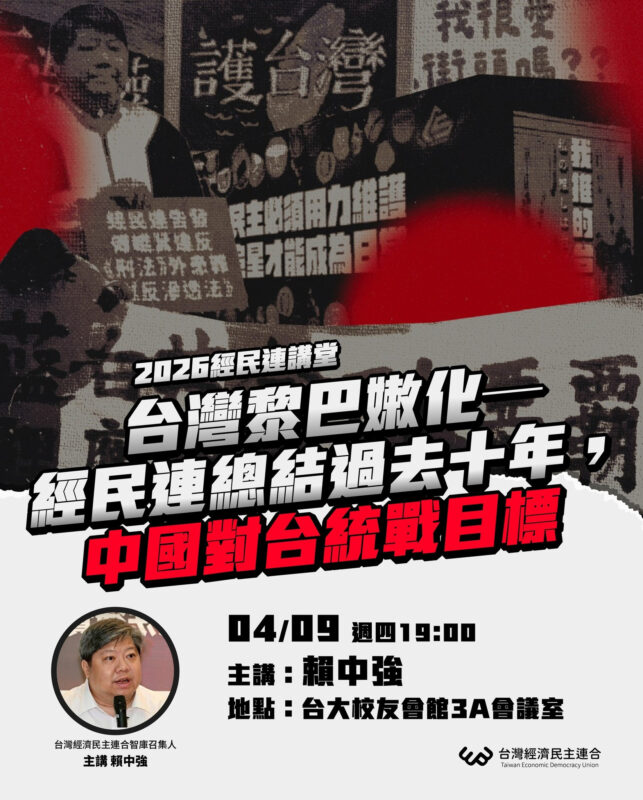 四月九日(星期四)晚上七點,在濟南路台大校友會館,2026年經民連講堂第二季第一堂,賴中強律師為您講解:台灣黎巴嫩化——經民連總結過去十年,中國對台統戰目標。現場活動將預留至少四十分鐘的討論時間,歡迎呼朋引伴,一起來討論。