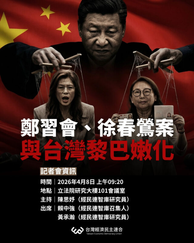 台灣經濟民主連合將於4月9日晚上七點在台大校友會館,舉行「2026年經民連講堂第二季第一堂:台灣黎巴嫩化——經民連總結過去十年,中國對台統戰目標」,智庫召集人賴中強將詳細說明經民連過去十年的總結觀察。本會並於4月8日上午先舉行記者會,向媒體朋友說明即將登場的鄭習會以及最近起訴的徐春鶯案,與中共推進「台灣黎巴嫩化」的密切關聯。