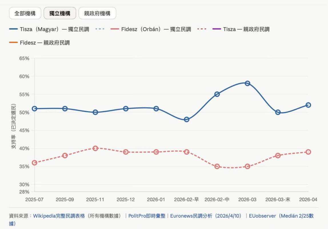 圖三 Magyar等獨立民調,橘線為執政黨,藍線為在野黨
