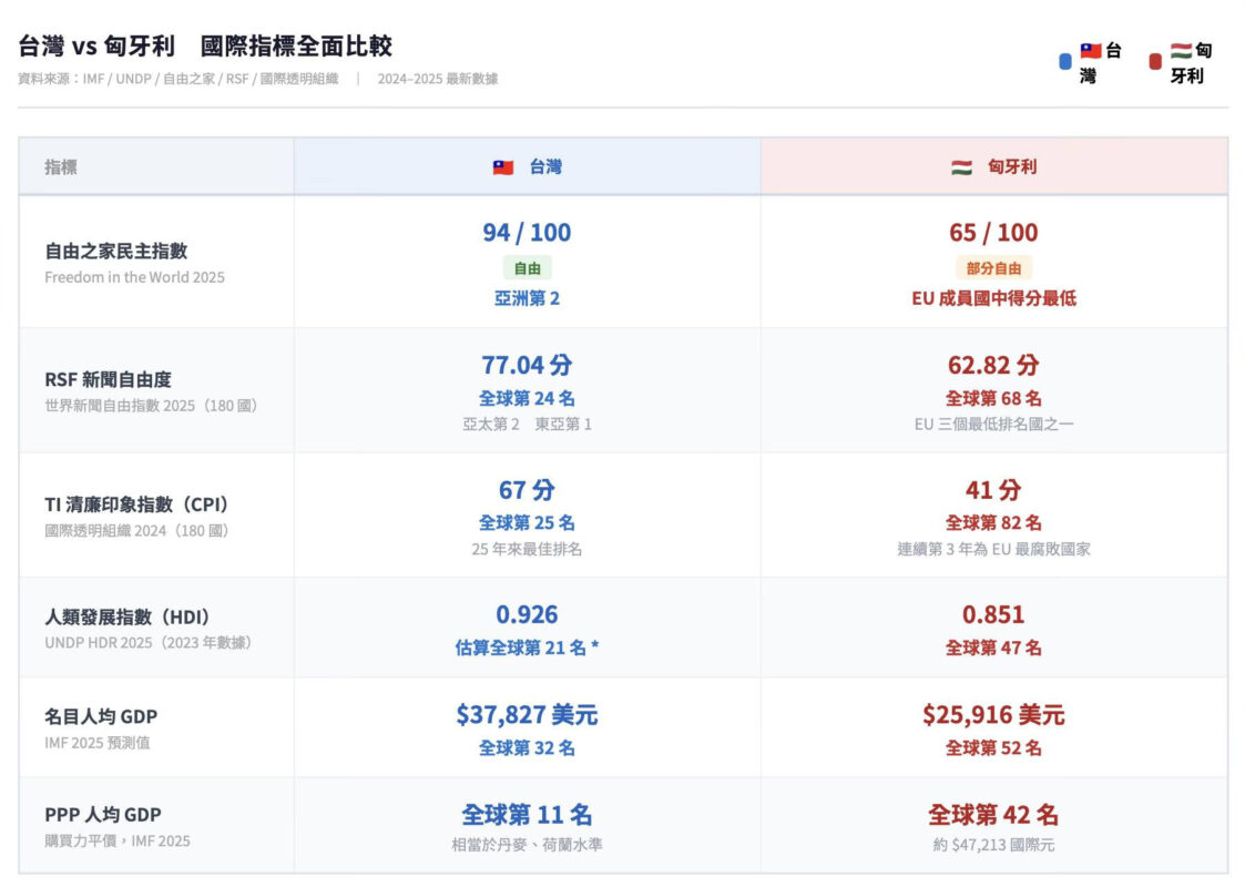 若你身邊有人唱衰民主、嫌棄政治太爛、抱怨台灣鬼島,請他們想想匈牙利。圖四是兩國各項國際指標評比,如果匈牙利人不肯放棄,台灣人更沒理由看輕自己。