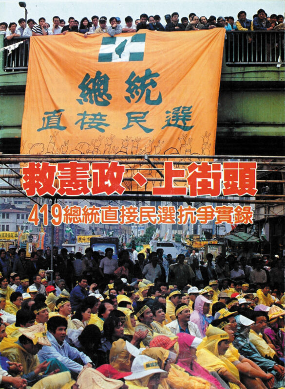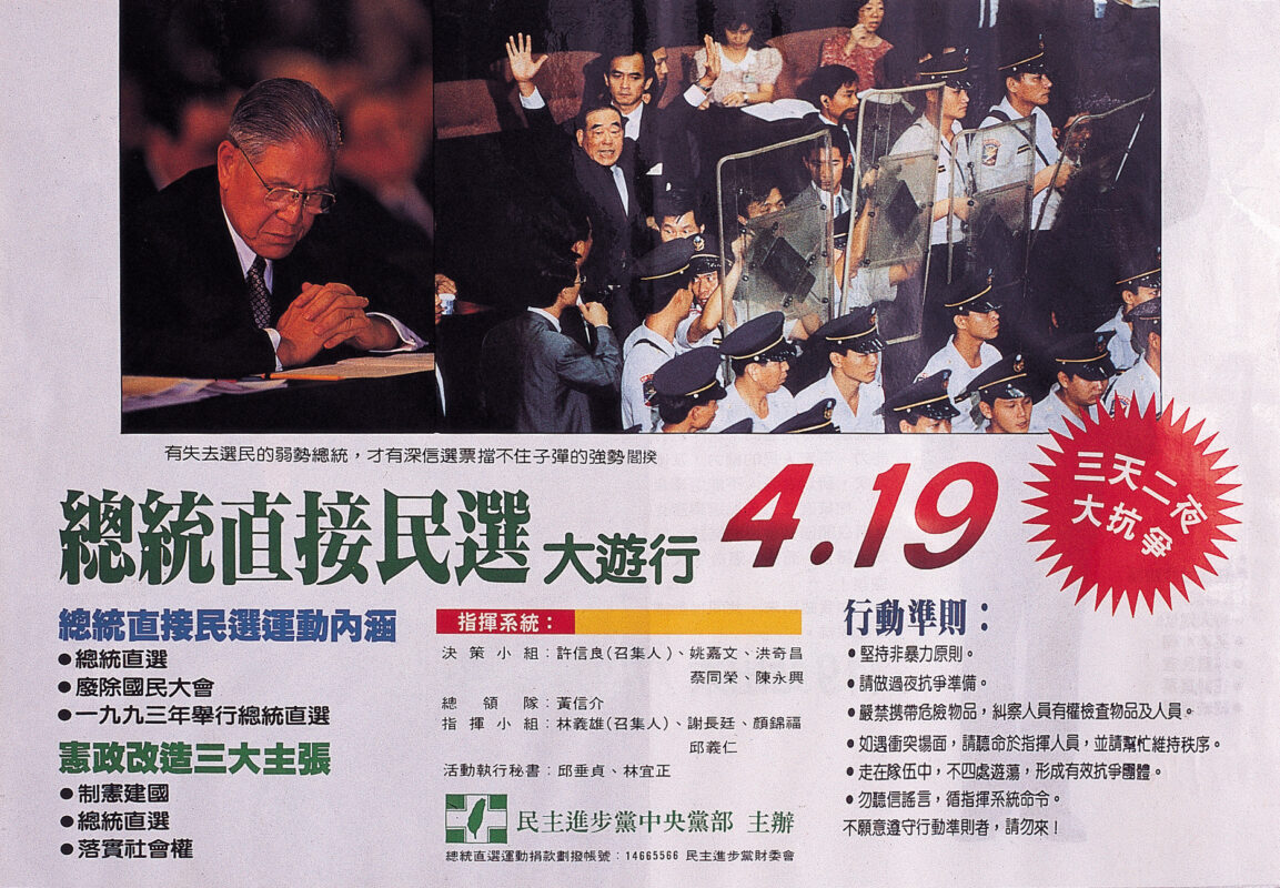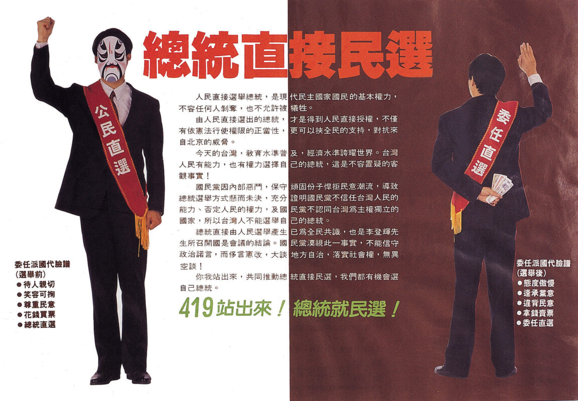1992年4月19日,民進黨發起「總統直選大遊行」,我負責設計這次的四一九總統直選傳單與海報,文宣上就清楚表示民進黨的決心。要展開三天二夜的長期抗爭,傳單上帶著面具的人,就是在諷刺國民黨修憲小組馬英九的「委任選舉」的主張。