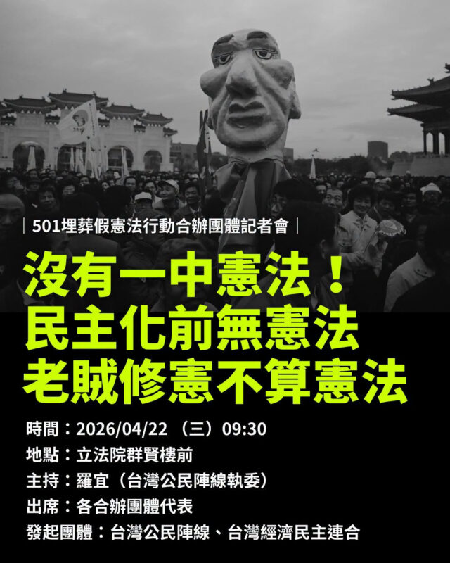 台灣公民陣線與各合辦團體,將於五月一日下午舉行「501埋葬假憲法行動」,我們要堅定地指出: