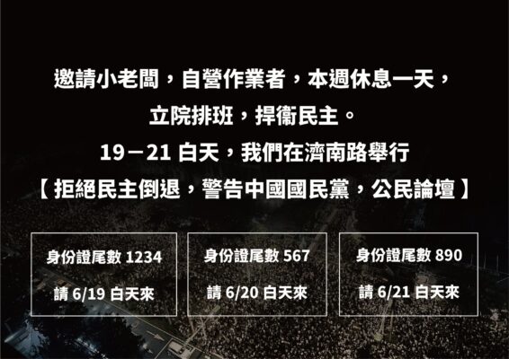 公民擋濫權法案、國民黨動員作亂 明天是最關鍵的一天,立法院將要表決覆議案。 我們需要更多的人來現場支持訴求,給........
