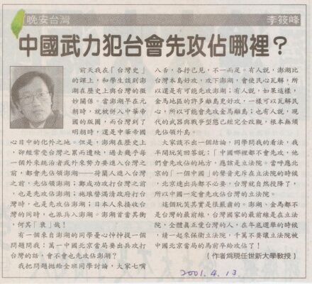 中國武力犯台會先攻佔哪裡? 李筱峰 這是我23年前在《自立晚報》上面的一篇文章,看看今天藍白政客在立法院中的胡........