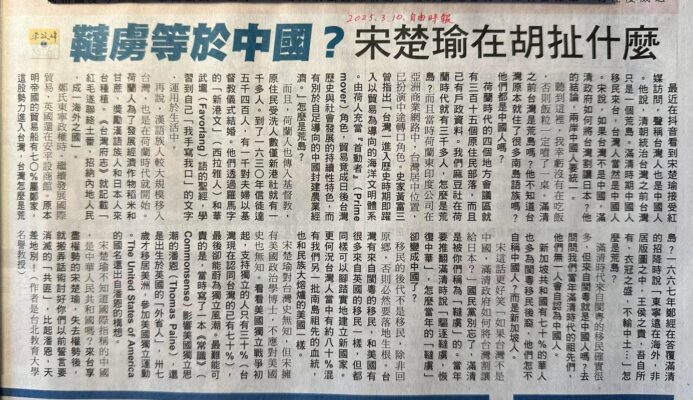 宋楚瑜在胡扯什麼? 李筱峰 最近在抖音看到宋楚瑜接受紅媒訪問,強調台灣人也是中國人。他說,清朝統治台灣之前台灣........