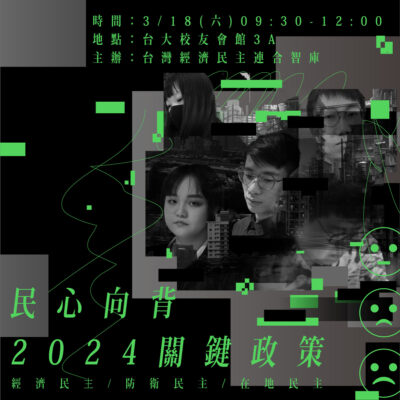 【活動推廣】2023/03/18 民心向背,2024關鍵政策 台灣經濟民主連合智庫 台灣即將在十個月後舉行大選........