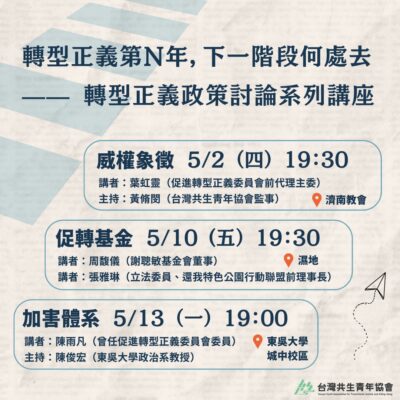 轉型正義第N年,下一階段何處去?—— 2025 轉型正義政策討論系列講座/歡迎報名參加!! 台灣共生青年協會 ........
