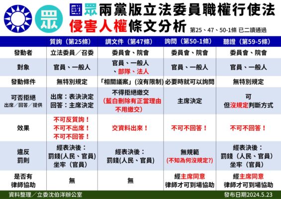 國眾兩黨版立法委員職權行使法侵害人權條文分析 沈伯洋 藍白擴權法案這台失速拼裝列車,實在太亂了,因此我們做了一........