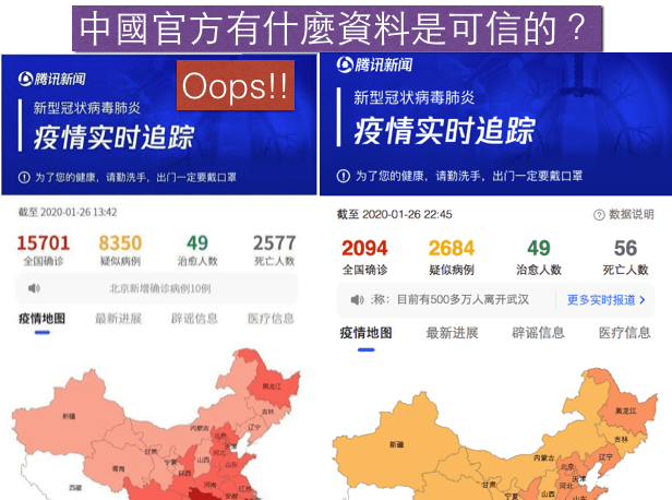 本圖取自騰訊新聞,1月26日某時刻忽然數字往上跳很多,然後又下修。同樣的數字也出現在網易新聞。2月1日的時候,同樣的狀況又出現了一次。對獨裁者來說,有人太過誠實是不好的事,當然,我們無法確認是有人「誤發」了未修飾的數字,還是純粹系統bug。在1/20習近平宣布要防疫之前,幾乎沒有什麼確診數字,也幾乎沒有報導,僅有的報導是官方宣布嚴懲率先披露疫情的人,說他們造謠,後來我們知道那八位被懲處的人都是第一線的醫師。習近平1/25宣布成立工作小組之後,一天之內防疫數字立刻獲得控制、沒有增加。後來才繼續上升。然後,2月13日時,中國一下子調高確診數字一萬三千多(理由是確診標準改變),在習近平撤換了湖北省委書記後,顯然是要先把前面的帳算一算。官方調控得宜,連死亡數都維持在完美的2%出頭比例,看來這個病毒也是在黨的掌控當中(?)。到底有什麼官方數字是可以相信的呢?恐怕沒人說得準。