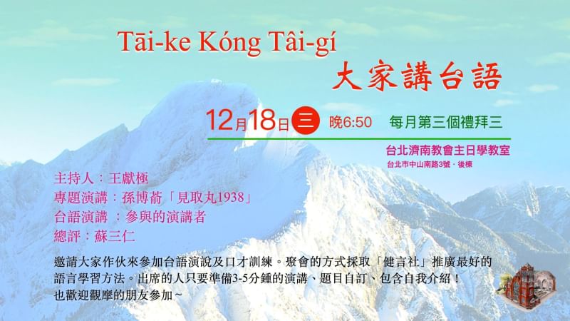 活動回顧⭕12/18大家講台語 2024/12/162025/01/01 台灣放送 ⭕12/18大家講台語Tāi-ke Kóng Tâi-gí 免報名,歡迎參加 主持人:王獻極 熱場:段震宇唱、吹、彈兩首台語歌及對現階段「復振台語」的看法與意見 演講者:4×5約20分鐘1、林大洲2、黃浩霆3、劉茜怡4、陳祈燿 專題演講:孫博萮題目:見取丸1938紀錄片觀賞+討論 總評:蘇三仁 ⭕特別來賓:台灣文學家陳明仁老師、金曲歌王朱頭皮 台灣放送 「台灣放送」是台灣民主防衛聯盟的網站,以推廣歷史知識、深化公民教育為宗旨,目的在提供國人較為周全的資訊,以了解台灣的過去,面對當代問題,為建立穩固、自由民主不退轉的國家備好道路。 本週青鳥行動:週三究責會,週五守護立院 【NGO國會預警系統電子報】20241215號