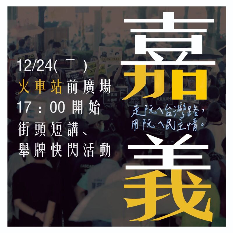 12/24晚間5:00 在嘉義火車站前廣場 街頭短講、舉牌快閃活動,一起來散步! 歡迎多多推廣消息!