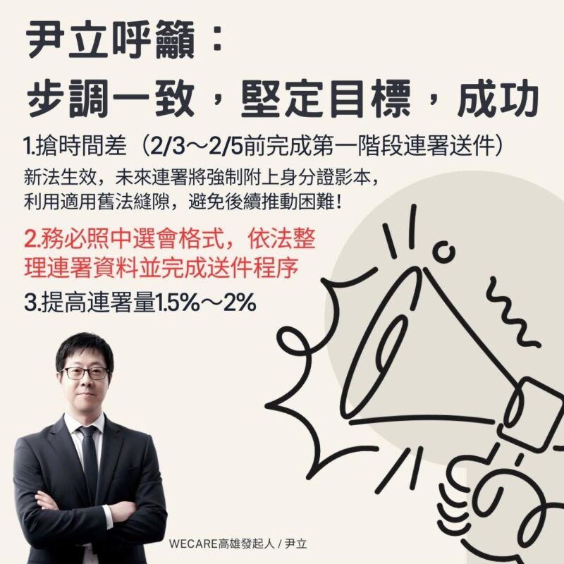 理由:格式若不正確可能被退件,浪費時間人力與打擊信心,甚至延誤無法適用舊法。而罷韓畢竟也過了幾年,中選會格式是否有修正也要確認,合法合規才有辦法往前走。