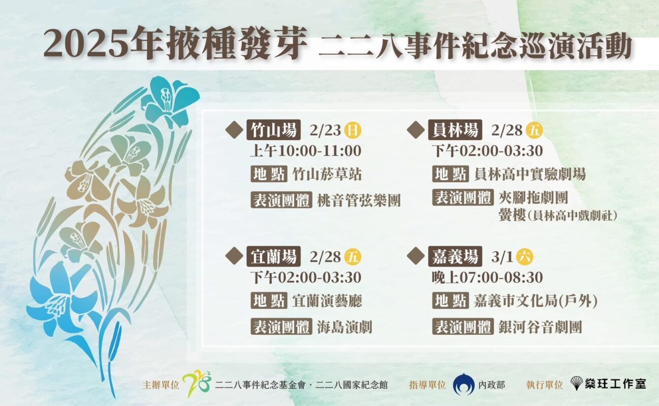 活動回顧轉型正義異世界 X 掖種發芽228紀念巡演 2025/02/052025/05/29 台灣放送 轉型正義異世界 X 掖種發芽228紀念巡演 國際書展+在地藝文,2025年的二二八事件紀念活動,既本土,更國際,歡迎大家參加! 台灣放送 「台灣放送」是台灣民主防衛聯盟的網站,以推廣歷史知識、深化公民教育為宗旨,目的在提供國人較為周全的資訊,以了解台灣的過去,面對當代問題,為建立穩固、自由民主不退轉的國家備好道路。 在桃園歷史迷宮中打怪— 2025在地公民行動 〈台灣經濟民主連合全力支持罷免運動綱領〉