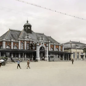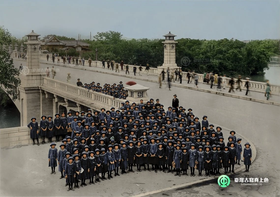 1939年佳冬公學校修學旅行至臺北,於明治橋留影紀念(圖經手繪上色)。