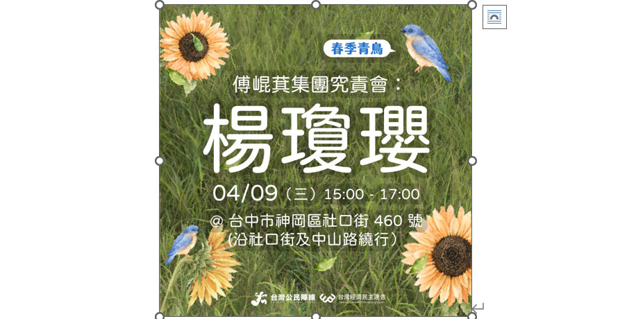 下週 04/09(三)下午,在神岡區,我們將舉行「春季青鳥──傅崐萁集團究責會」,偕同中三拒瓔罷團走過巷弄街頭,究責的對象為台中第三選區(后里、神岡、大雅、潭子)的濫權立委:楊瓊瓔。