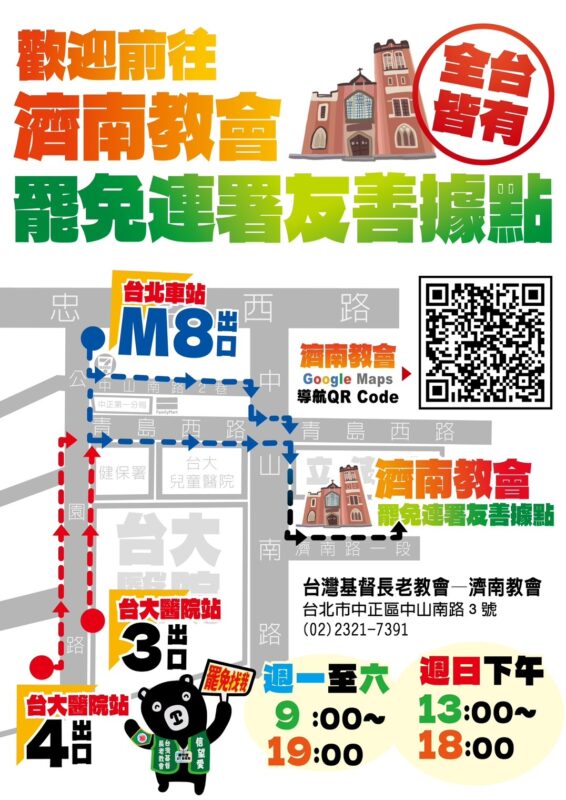 公民養成, 分類文章, 國家認同, 活動回顧, 獨裁的進化與反撲, 當代台灣, 認識民主/民主防衛濟南教會罷免連署友善據點指引/含志工訓練訊息 2025/04/042025/05/29 台灣放送 濟南教會罷免連署友善據點指引/含志工訓練訊息 濟南教會 台灣放送 「台灣放送」是台灣民主防衛聯盟的網站,以推廣歷史知識、深化公民教育為宗旨,目的在提供國人較為周全的資訊,以了解台灣的過去,面對當代問題,為建立穩固、自由民主不退轉的國家備好道路。 濟南教會連署站/清明連假開設時間表 【春季青鳥系列:魯明哲究責會】
