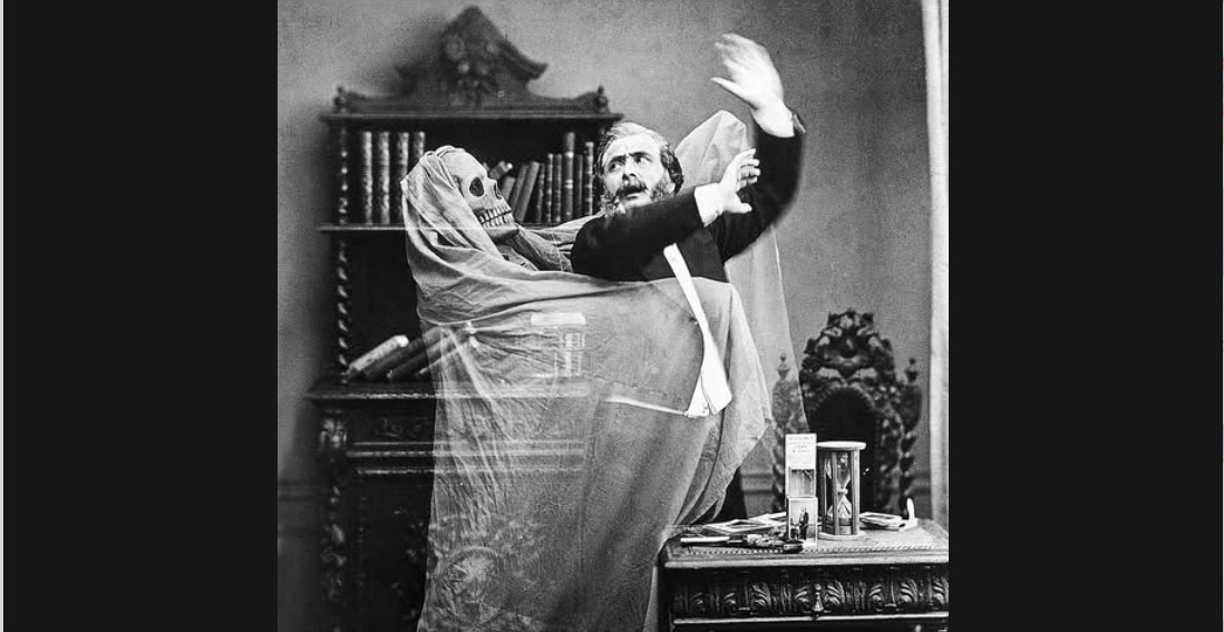 圖為1863年法國魔術師亨利.羅賓(Henri Robin)與鬼魂的雙重曝光照片,歐仁.提波(Eugène Thiébault)拍攝