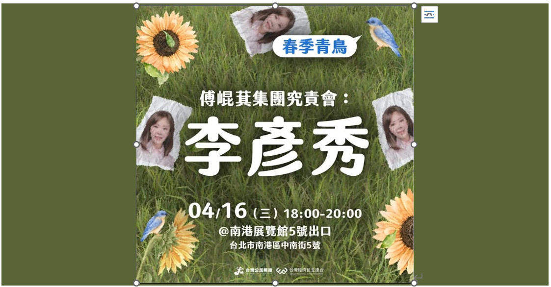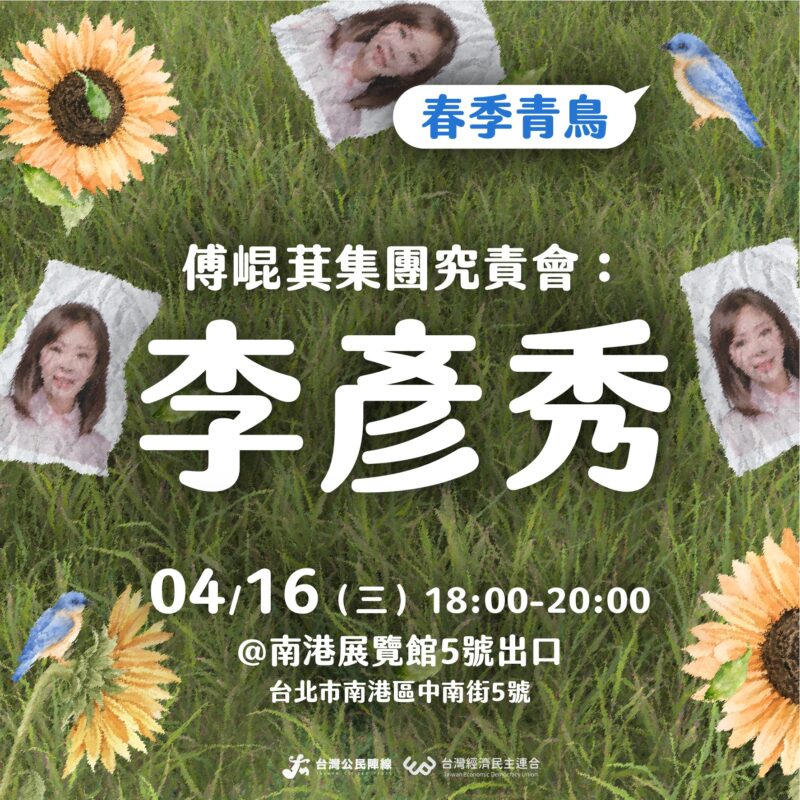 本週六晚間,經民連與公民陣線將在捷運南港展覽館站外舉行【春季青鳥系列:李彥秀究責會】,邀請港湖自主公民站出來,齊聲控訴:擔任多重黨職的李彥秀,在立法院執行傅崐萁的意旨,推動多項民主倒退法案、亂刪除亂凍結預算,心中只有黨意,沒有民意!