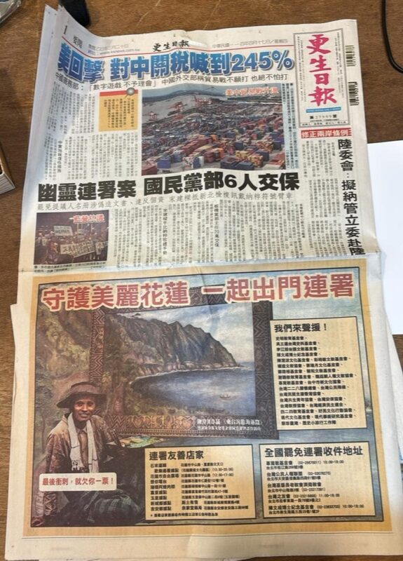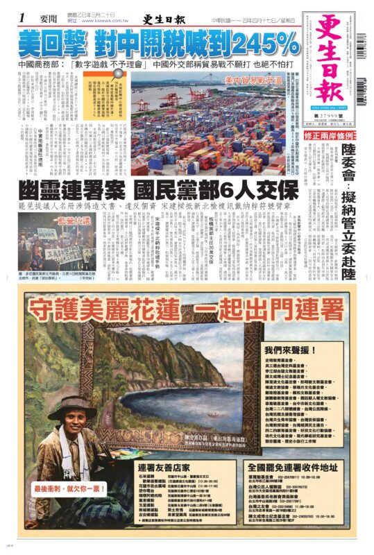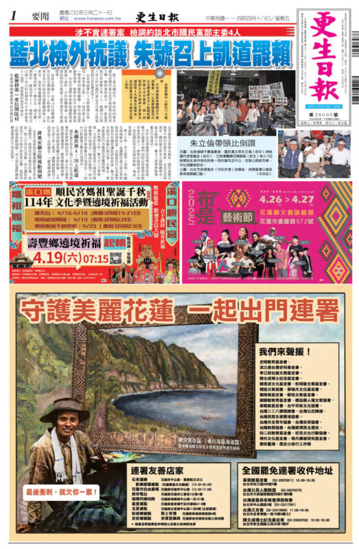 今天(4/17)花蓮地方報《更生日報》頭版刊登半版聲援花蓮罷傅的廣告。