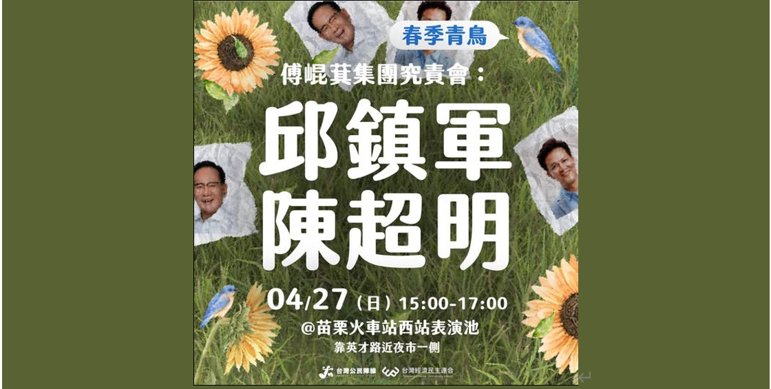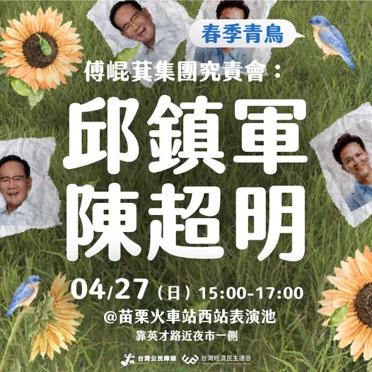 【春季青鳥:傅崐萁集團究責會】本週日下午將在苗栗市舉行,究責對象是苗栗的濫權立委陳超明及邱鎮軍。邀請苗栗的民眾站出來!一起為 5 月 12 日二階連署送件,進行衝刺宣講。