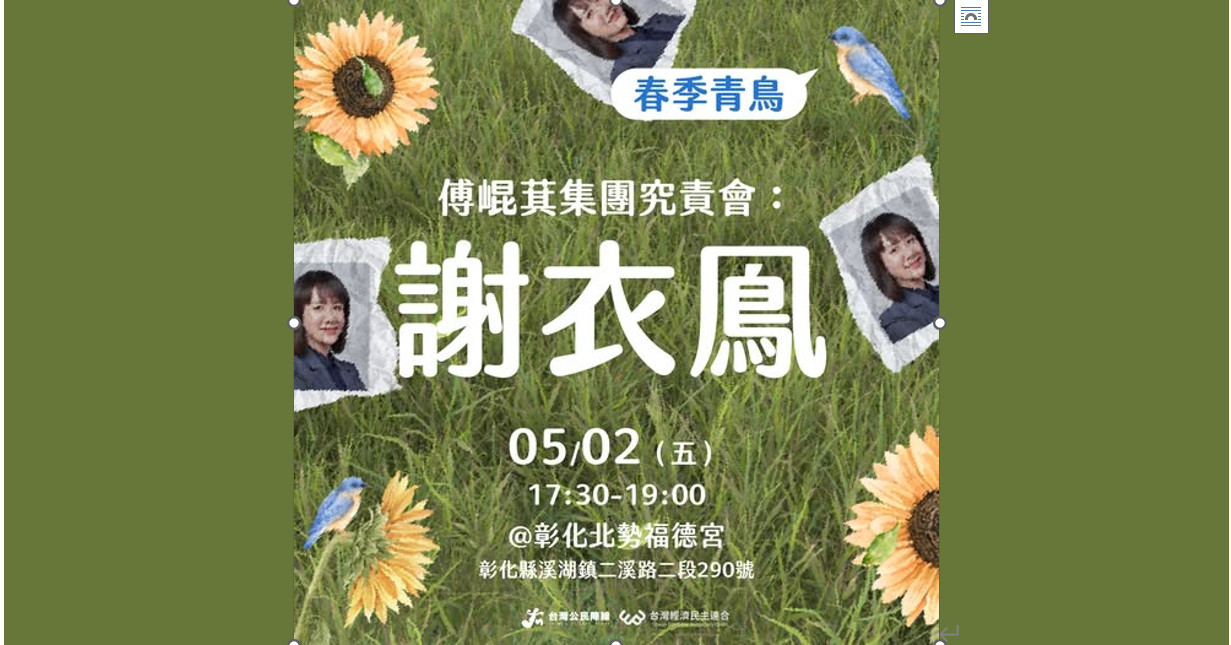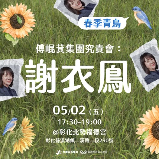 【春季青鳥:傅崐萁集團究責會】將在週五彰化溪州舉行,究責彰化第三選區(溪州、北斗、埤頭、竹塘、二林、芳苑、大城、溪湖、埔心、埔鹽)立委謝衣鳯。