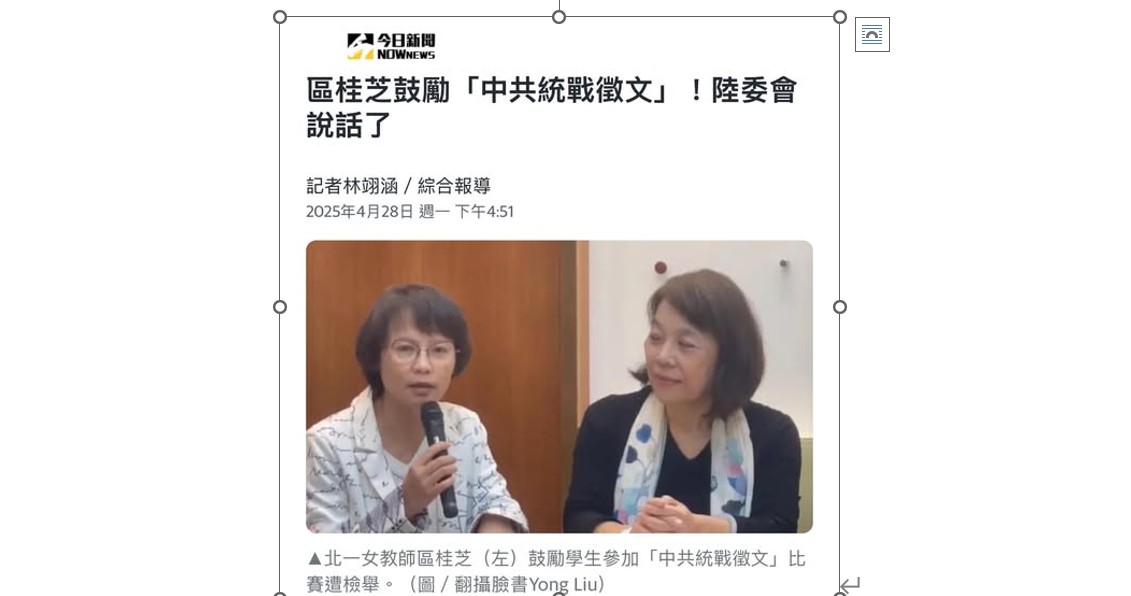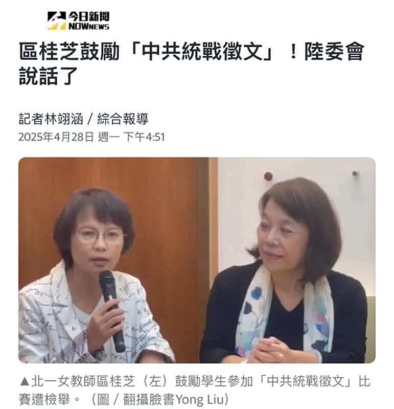 近日,「中華民國章法學會」跟中共黨政機關手牽手辦活動,名為「2025年第2屆『共讀一本好書』徵文大賽」。北一女的國文老師區桂芝,可能覺得這是個學習中文的好機會,就在LINE群組裏轉發活動資訊,鼓勵學生踴躍參加。結果呢?馬上有人覺得事件不單純,一紙狀告到陸委會,說區桂芝跟中共黨政軍機構合作,涉嫌違反《兩岸條例》第33條之1。陸委會今天表示,已移請教育部查處。