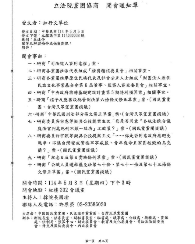 立法院總質詢至本週二(今日05/06)截止,從本週五開始的院會將進入法案審查,並可能進行議案二、三讀表決。根據立法院黨團協商開會通知,韓國瑜院長召集於本週四(05/08)下午進行朝野黨團協商,協商案件共計十案,其中以下六案特別值得注意:
