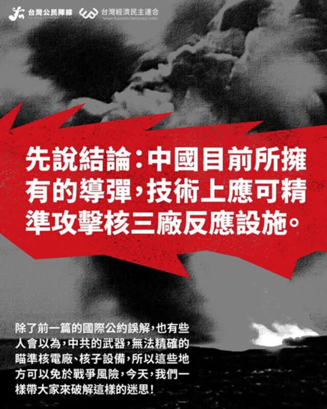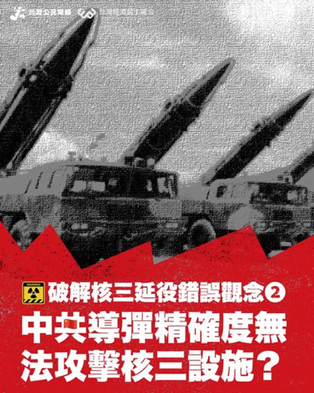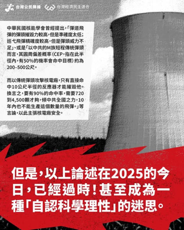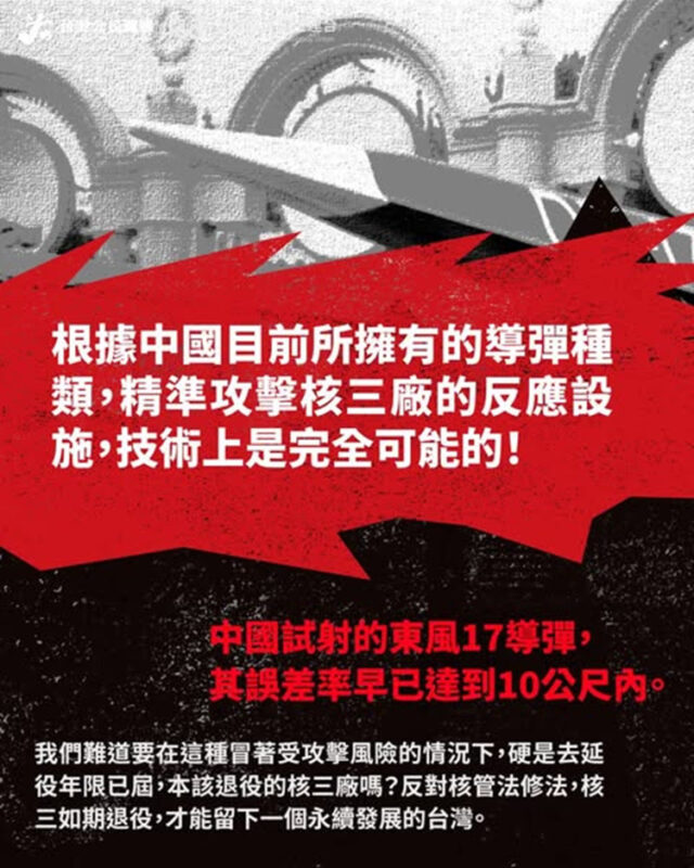 重啟核三廠,地震斷層帶風險不變、半世紀前的舊技術不變、大量核廢料無解不變、設備只會更老更舊更不安全,而且將面對台海衝突中國可能攻擊核三廠的嚴重國防安全缺陷。