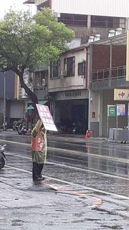 阿美給我看上週末Terry在草屯雨中站路口的照片。