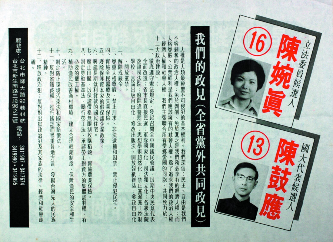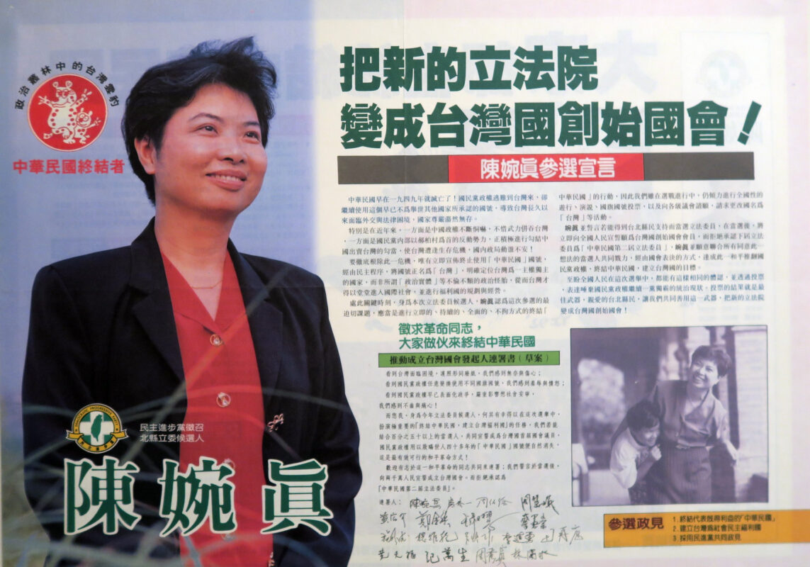 1995年競選連任,因呼聲過高,選民配票,造成她以些微票數落選。1996年轉戰台北縣第三選區國大代表,我再次為陳婉真操刀設計文宣,以最高票當選,她被推舉為民進黨國大黨團幹事長。