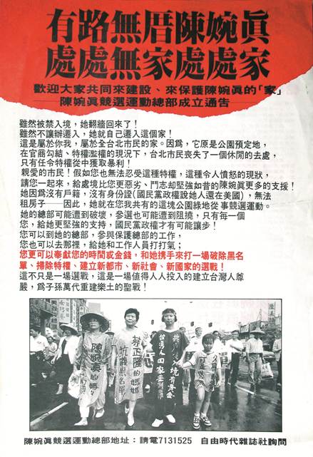 國民黨一直抓不到陳婉真,乾脆來個「相應不理」。陳婉真帶著九哥去內政部門口靜坐抗議,要求設籍,內政部卻說,她沒有入境許可證,表示法律上她人還在美國,拒絕辦理。國民黨不讓她設籍落戶,我為陳婉真設計有路無厝抗爭文宣。為此和國民黨周旋數個月之久,陳婉真最後被以違反國安法「非法入境」判刑5個月。