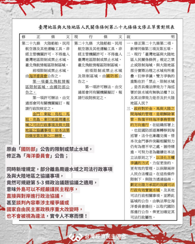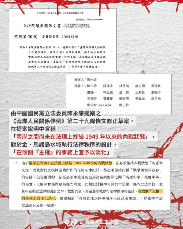 由中國國民黨立法委員陳永康提案之《兩岸人民關係條例》第二十九條條文修正草案,在提案說明中宣稱「兩岸之間尚未在法理上終結 1949 年以來的內戰狀態」,對於金、馬諸島水域執行法律秩序的設計,「在攸關『主權』的事務上宜予以淡化」,因此提案將原由「國防部」公告的限制或禁止水域,修正為「海洋委員會」公告;同時新增規定,金門、東碇、烏坵、馬祖、亮島、東引地區周邊水域之司法行政事項及與大陸地區之協議事項,竟然可規避第 5-3 條政治議題協議之適用,意味外島可以不經嚴謹民主程序,直接與對岸進行政治協議,甚至談判內容牽涉主權爭議或國家自由民主憲政秩序重大改變時,也不會被視為違法,實令人不寒而慄。
