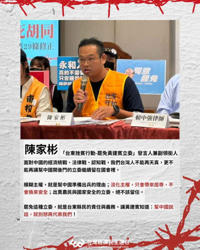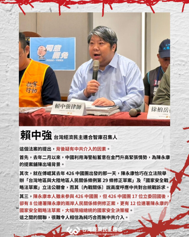 台灣經濟民主連合與「罷免游顥-去游除垢」、「台東挫賓行動-罷免黃建賓立委」、「台灣鷹爸」徐柏岳飛官以及到場聲援罷團,今(12)日召開記者會,譴責陳永康提案簡直就是迎合中國「兩岸同屬一個中國」話術,將台海關係定位為內戰關係,形成「台灣問題是中國內政問題」的法律框架,未來若中共武力威脅台灣,讓台灣更難向國際友盟尋求支持與援助。