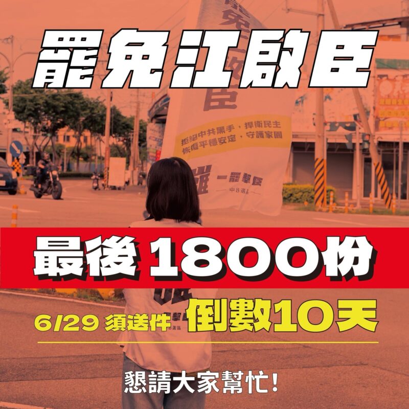 台中罷免顏寬恆、楊瓊瓔、江啟臣三罷團,昨日都已收到中選會公告,補件10天正式起跑,至6月30日止。了解內情者無不憂心忡忡,尤其罷免江啟臣尚需1800件 ,被視為是難上加難!主要是國民黨、盧秀燕及江所屬的台中紅派,全面動員護衛。