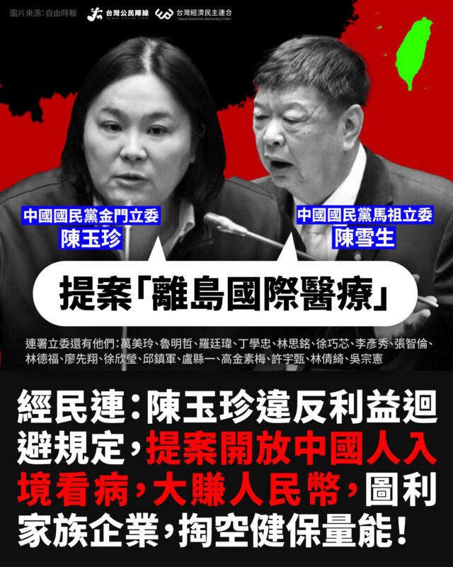 去年經濟委員會審查時,經民連就曾公開檢舉陳玉珍違反利益迴避相關規定:2020年11月1日三立新聞就有「家族擁健檢中心 陳玉珍提設醫療特區」的報導、2016年7月19日金門日報更曾報導,金健康健檢中心執行長陳玉珍議員邀請名醫來中心駐診。經民連去年已公開檢舉並要求,立法院紀律委員會應調查陳玉珍的此一大賺人民幣,圖利家族企業,掏空健保量能提案,是否違反《立法委員行為法》第五章利益迴避之規定,調查結果出來前,應先停止經濟委員會之法案審查程序。然而,立法院韓國瑜院長及紀律委員會至今仍充耳不聞。
