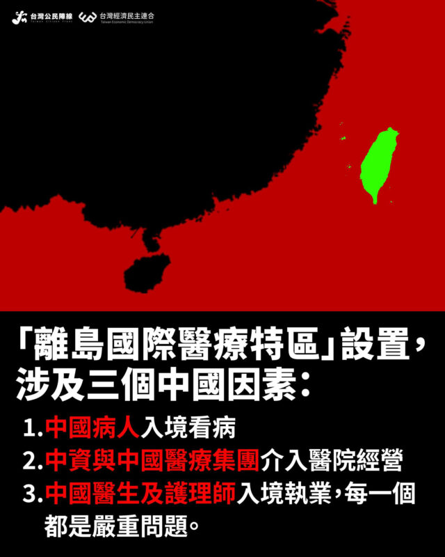 「離島國際醫療特區」設置,涉及三個中國因素,(1)中國病人入境看病,(2)中資與中國醫療集團介入醫院經營,(3)中國醫生及護士入境執業,每一個都是嚴重問題。