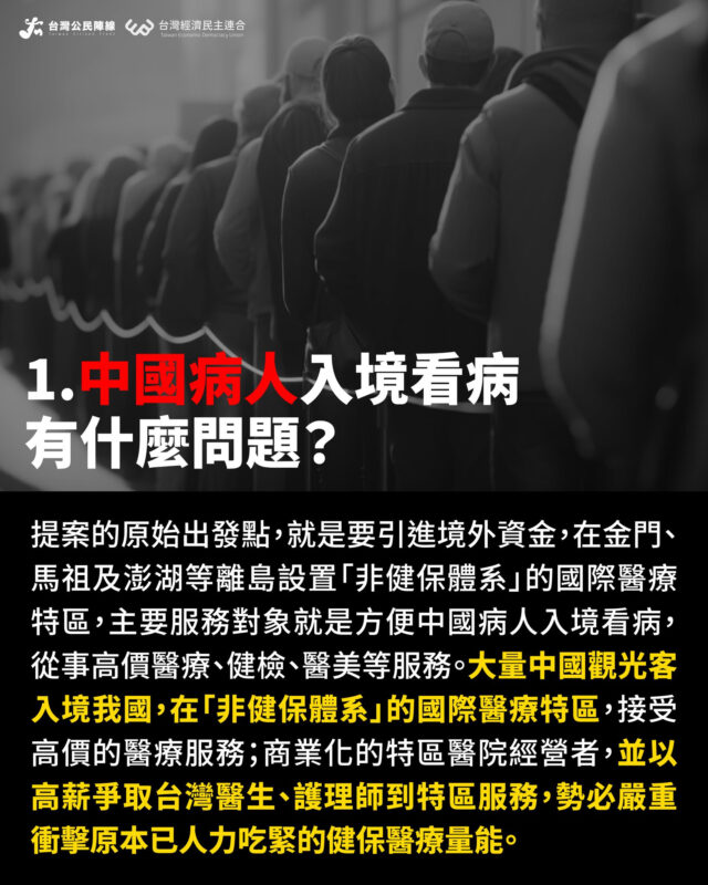 中國病人。與此次《離島建設條例》修正,相同內容的草案,陳玉珍在上一屆國會2020年就已提出,隔年五月委員會審查之前,陳玉珍向時任衛福部長陳時中遊說:「未來如能善用金門的特殊地理位置,吸引大陸來的醫療客戶,以觀光休閒、健康醫療、健檢、醫美等服務,帶動高端消費者,一定能促進金門各行各業的蓬勃發展。」顯見,此提案的原始出發點,就是要引進境外資金,在金門、馬祖及澎湖等離島設置「非健保體系」的國際醫療特區,主要服務對象就是方便中國病人入境看病,從事高價醫療、健檢、醫美等服務。大量中國觀光客入境我國,在「非健保體系」的國際醫療特區,接受高價的醫療服務;商業化的特區醫院經營者,並以高薪爭取台灣醫生、護士到特區服務,勢必嚴重衝擊原本已人力吃緊的健保醫療量能。