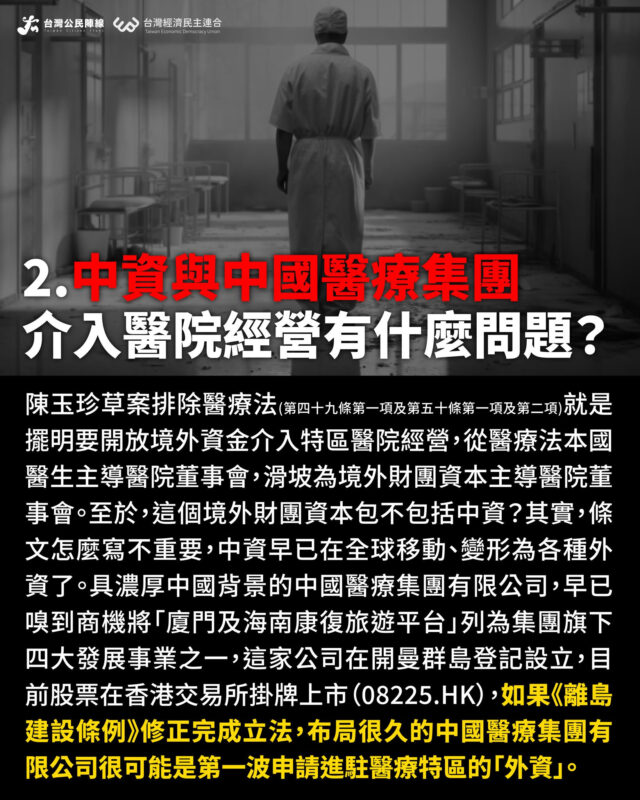 中資與中國醫療集團介入醫院經營。陳玉珍草案排除醫療法第四十九條第一項及第五十條第一項及第二項關於「法人不得為醫療社團法人之社員」「董事三分之二以上應具醫事人員資格」「外國人不得擔任董事長」,這就是擺明要開放境外資金介入特區醫院經營,從醫療法本國醫生主導醫院董事會,滑坡為境外財團資本主導醫院董事會。至於,這個境外財團資本包不包括中資?其實,條文怎麼寫不重要,中資早已在全球移動、變形為各種外資了。具濃厚中國背景的中國醫療集團有限公司,早已嗅到商機將「廈門及海南康復旅遊平台」列為集團旗下四大發展事業之一,這家公司在開曼群島登記設立,目前股票在香港交易所掛牌上市(08225.HK),如果《離島建設條例》修正完成立法,布局很久的中國醫療集團有限公司很可能是第一波申請進駐醫療特區的「外資」。