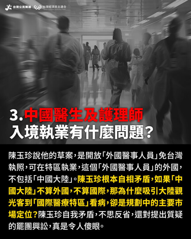 中國醫生及護士入境執業。陳玉珍說他的草案,是開放「外國醫事人員」免台灣執照,可在特區執業,這個「外國醫事人員」的外國,不包括「中國大陸」。陳玉珍根本自相矛盾,如果「中國大陸」不算外國,不算國際,那為什麼吸引大陸觀光客到「國際醫療特區」看病,卻是規劃中的主要市場定位?陳玉珍自我矛盾,不思反省,還對提出質疑的罷團興訟,真是令人傻眼。