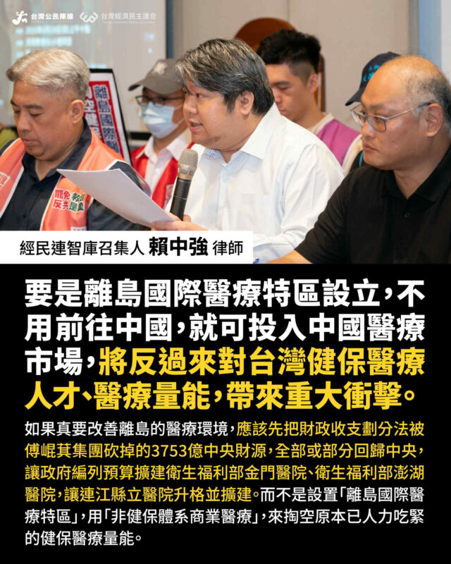 經民連智庫召集人賴中強指出,如果真要改善離島的醫療環境,應該先把財政收支劃分法被傅崐萁集團砍掉的3753億中央財源,全部或部分回歸中央,讓政府編列預算擴建衛生福利部金門醫院、 衛生福利部澎湖醫院,讓連江縣立醫院升格並擴建;而不是設置「離島國際醫療特區」,用「非健保體系商業醫療」,來掏空原本已人力吃緊的健保醫療量能。