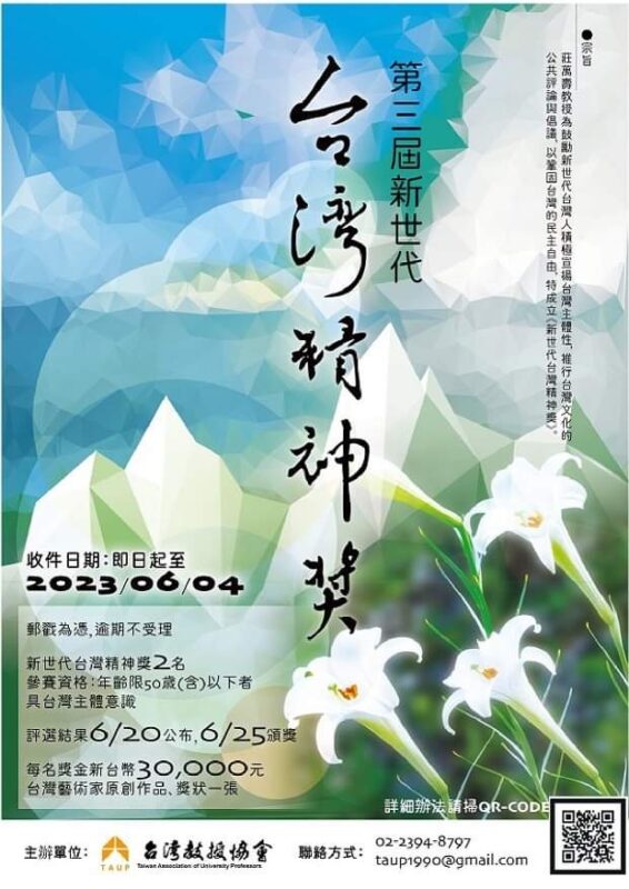 活動回顧【活動推廣】2023/06/25 台灣教授協會 — 第三屆新世代 台灣精神獎 頒獎 2023/03/032023/07/04 台灣放送 第三屆新世代 台灣精神獎 台灣教授協會 台灣放送 「台灣放送」是台灣民主防衛聯盟的網站,以推廣歷史知識、深化公民教育為宗旨,目的在提供國人較為周全的資訊,以了解台灣的過去,面對當代問題,為建立穩固、自由民主不退轉的國家備好道路。 【名單之後】臺灣八景八仙山與本田日露史 台灣加油!!