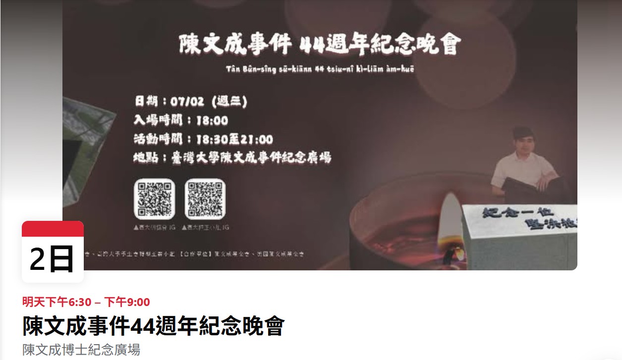 我們邀請所有關心台灣民主自由、公共事務,以及轉型正義與歷史真相的夥伴們,一同參與今年的陳文成事件四十四周年紀念晚會,紀念一位堅決抵抗國家暴力的勇者,並在道長且阻的民主路上,聆聽夥伴們的實踐與發聲。