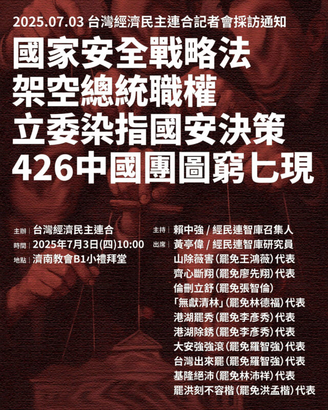 國家安全戰略法 架空總統職權 立委染指國安決策 426中國團圖窮匕現/2025.07.03 台灣經濟民主連合記者會採訪通知