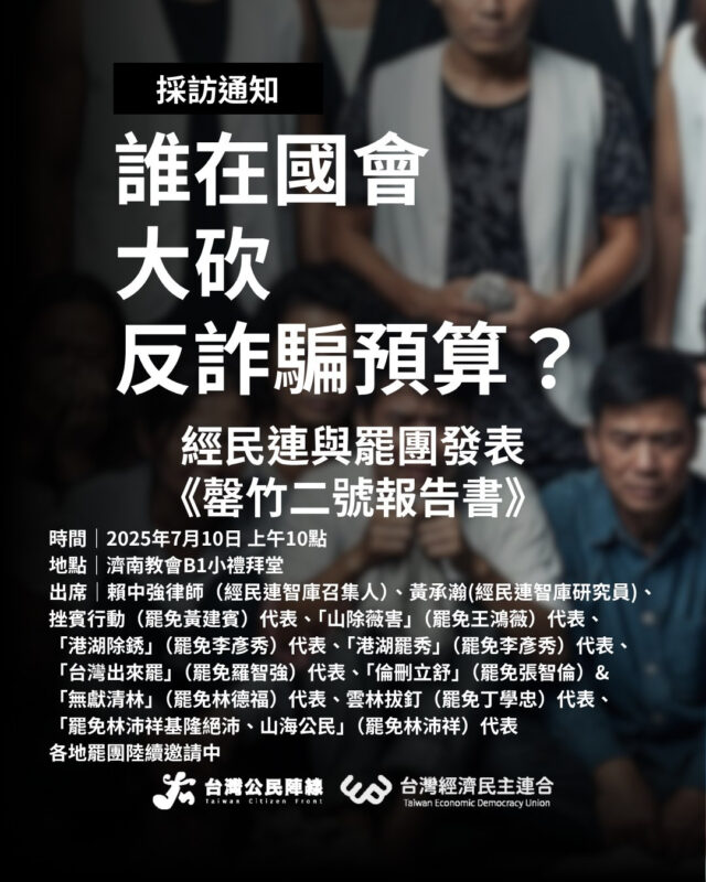 【誰在國會大砍反詐騙預算?經民連與罷團發表《罄竹二號報告書》】/2025.07.10上午台灣經濟民主連合記者會採訪通知