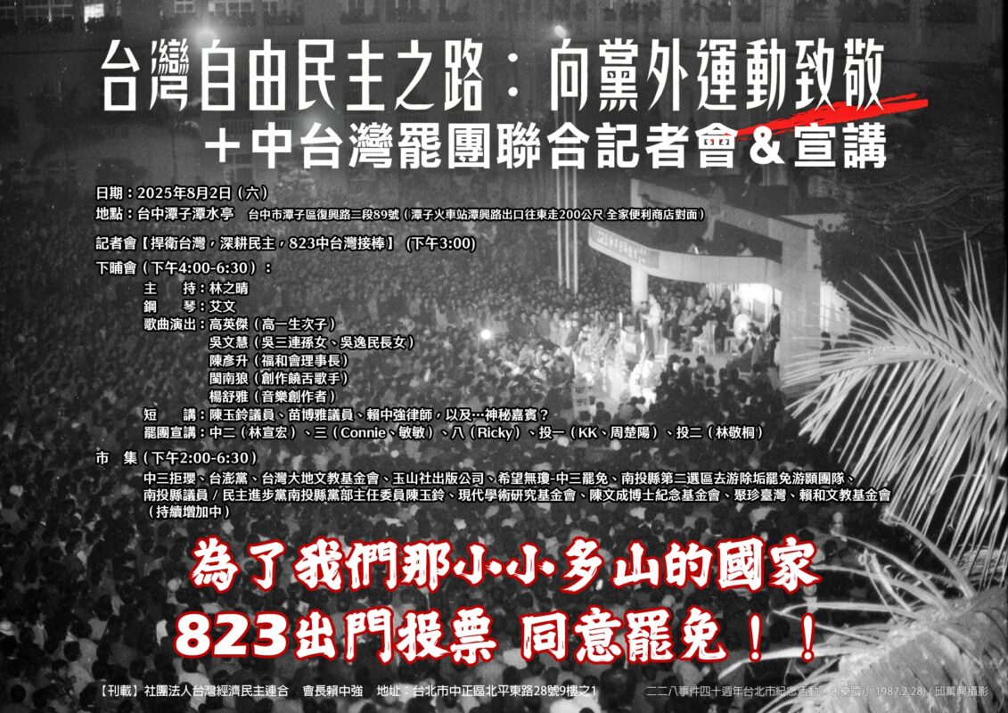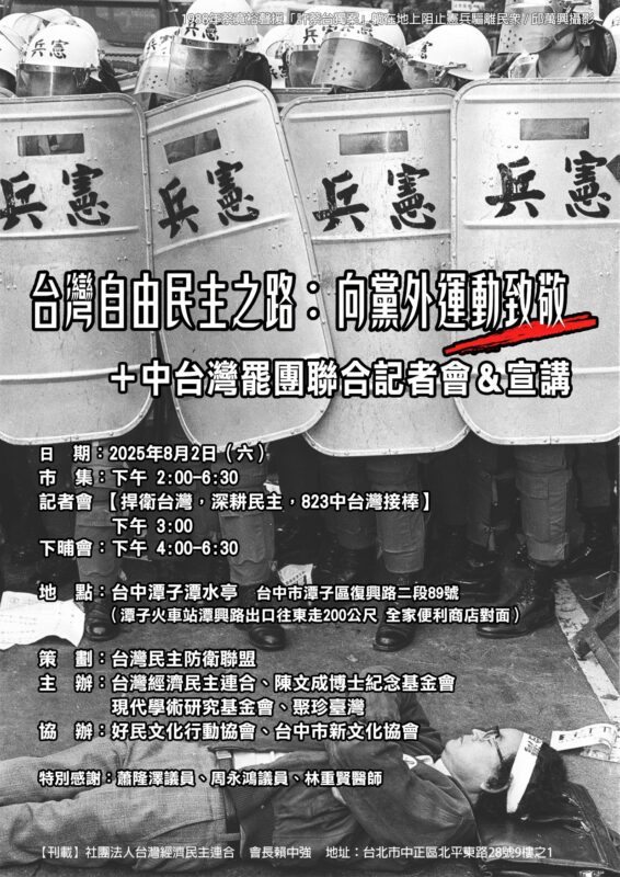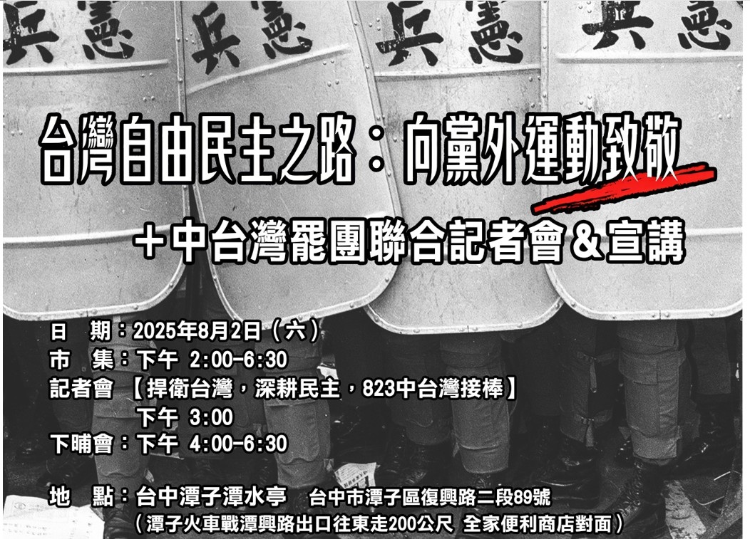 繼續拼搏!!8/2【捍衛台灣,深耕民主,823中台灣接棒】記者會&【致敬黨外運動】市集・下晡會
