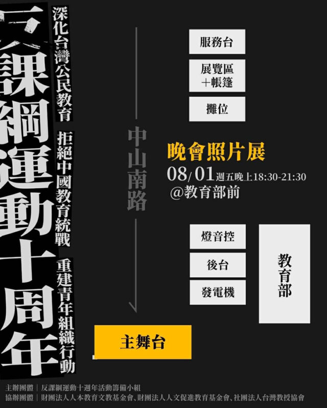 公民養成, 國家認同, 獨裁的進化與反撲, 當代台灣, 認識民主/民主防衛【反課綱運動十週年晚會與影像展】(8/1 1830-2130) 2025/08/012025/08/01 台灣放送 【反課綱運動十週年晚會與影像展】(8/1 1830-2130) 反課綱運動十週年籌備小組會 時間:8/1(五)1830~2130地點:教育部前 竭誠歡迎參加!! 圖一 圖二 台灣放送 「台灣放送」是台灣民主防衛聯盟的網站,以推廣歷史知識、深化公民教育為宗旨,目的在提供國人較為周全的資訊,以了解台灣的過去,面對當代問題,為建立穩固、自由民主不退轉的國家備好道路。 難忘的金門演講 唯一可以收集13款台灣旗的所在,就在明天(8/2)台中潭子潭水亭!!